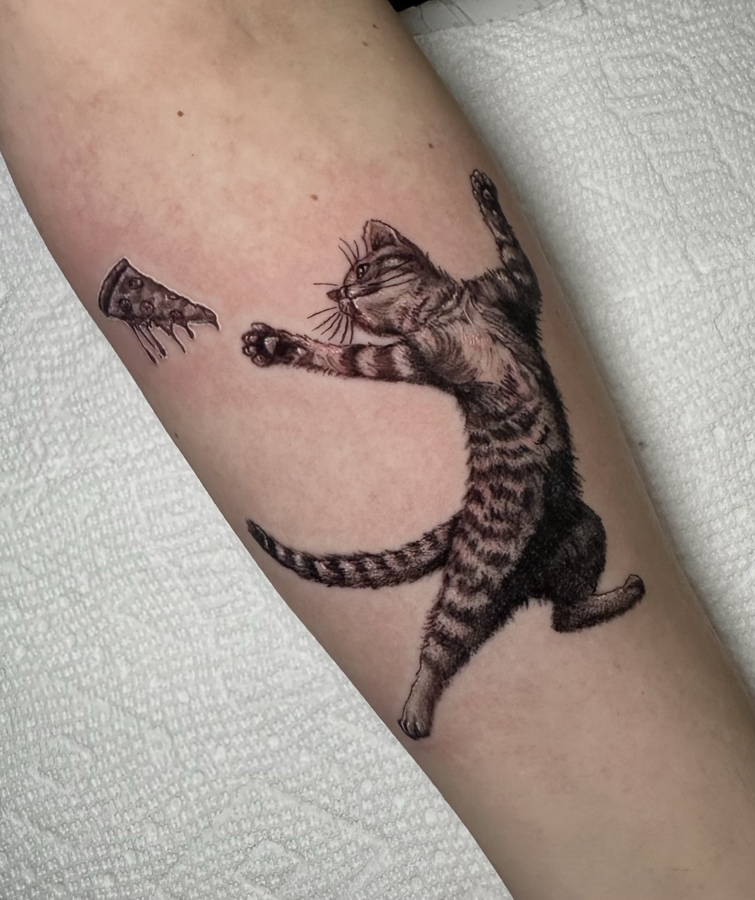 Pizza Kitten Tattoo by Rachel Rush at Double Diamond Tattoos in West Chester