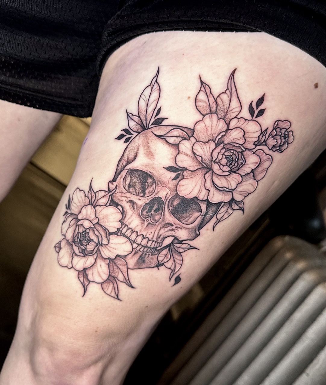 Skull and Flowers Tattoo by Rachel Rush at Double Diamond Tattoos in West Chester